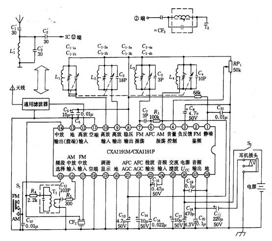 2、本实训中的收音机是一种50型的AM/FM二波段的收音机,收音机电路主要由索尼公司生产的专为调频、调幅收音机设计的大规模集成电路CXA1191M/CXC1191P组成。由于集成电路内部无法制作电感、大电容和大电阻,故外围元件多以电感、电容和电阻为主,组成各种控制、供电、滤波等电路。50型收音机电路图如图2所示。