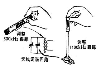 提示 统调结果正确与否,我们可以用铜、铁棒来鉴别。当统调正确时,用铜铁棒的两头分别靠近磁性天线线圈后,整机输出都会下降(即收音机的声音变小)这种现象称为“铜降”和“铁降”,否则称为“铜升”和“铁升”。若“铁升”,则说明电感量不足,应增加电感量,将线圈往磁棒中心移动,若“铜升”,则反之。在高频端,若“铁升”应增加电容量:若“铜升”,则应减小电容量。按上述方法反复进行调整,直至高频端和低频端都完全统调好为止,在一般情况下,低频端和高频端统调好后,中频端1000kHz的失谐不会太大,至此,三点频率跟踪已完成。