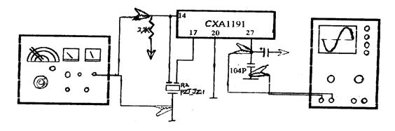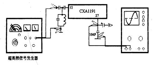 高频信号发生器输出频率为10.7MHz,电平为99dB,调制频率为1000Hz,频偏为±22.5kHz的调频信号。对于分立元件组成的调谐器,10.7MHz信号经中频输入电路引出,用夹子夹在混频管的塑料壳上,由电路中的分布电容耦合到电路中去,对于集成电路组成的调谐器,10.7MHZ的中频调频信号可直接加到调频天线连接的信号输入端。
