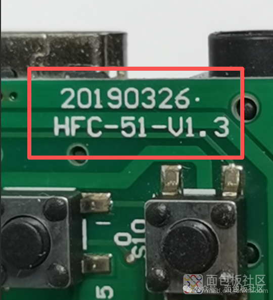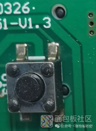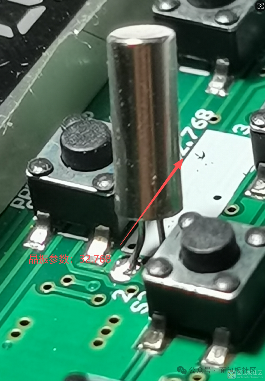 在按键开关的中间躺着一个晶振,把它竖立起来,想看看它的参数,结果没有任何字体,等把它竖立起来,印制板上丝印这32.768.