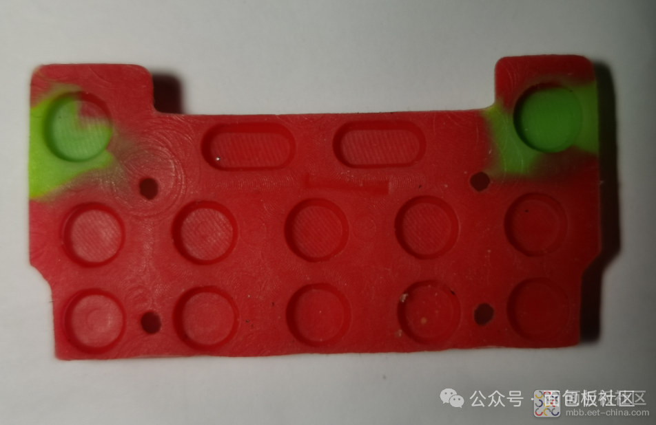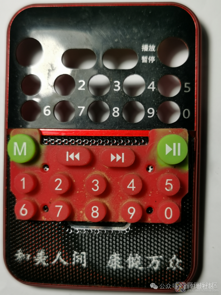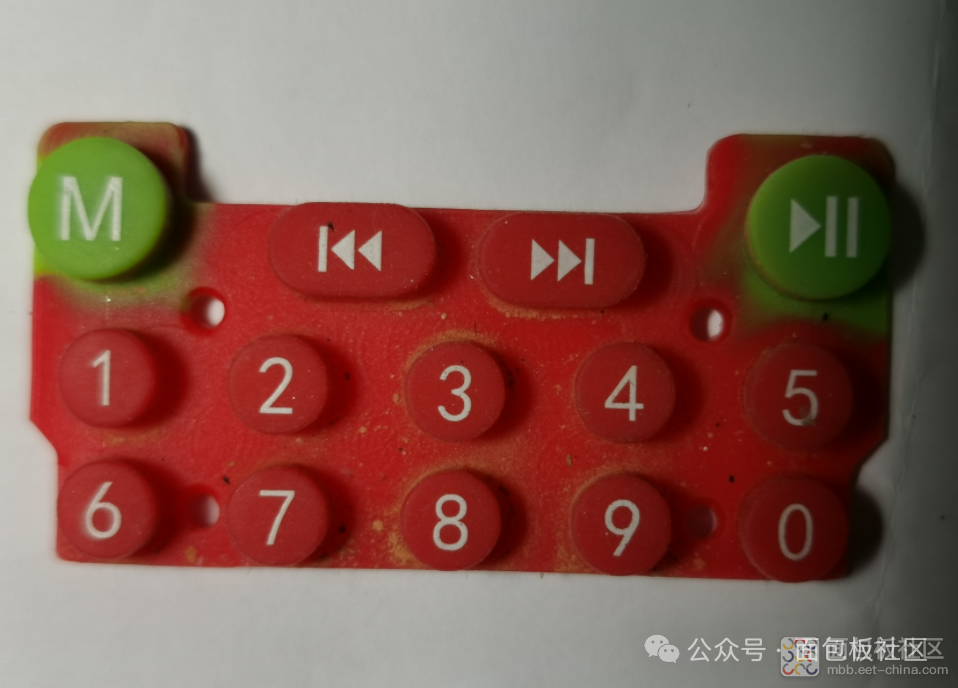 收音机的按键膜,原来绿色的是在红色底板颜色上喷涂上绿色颜料。