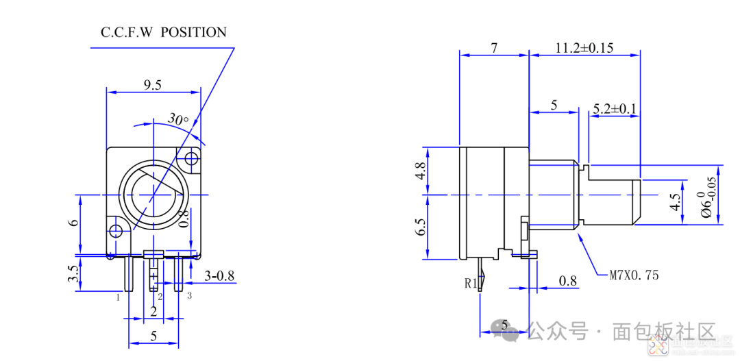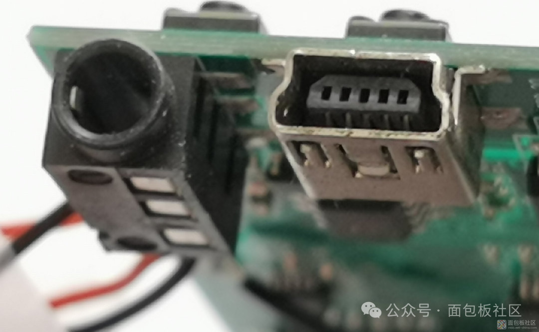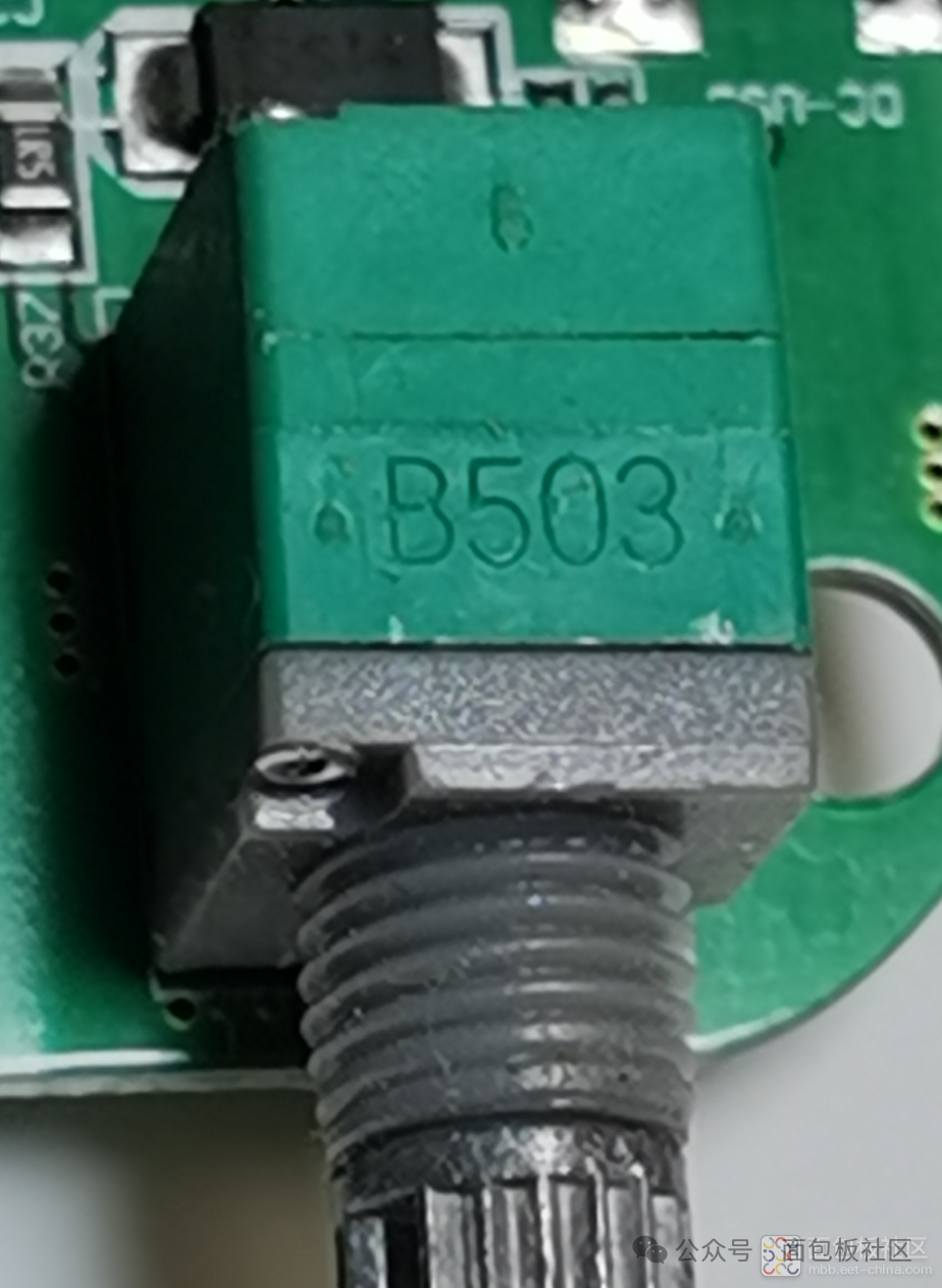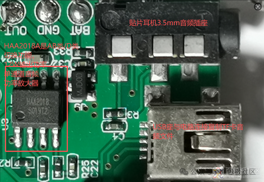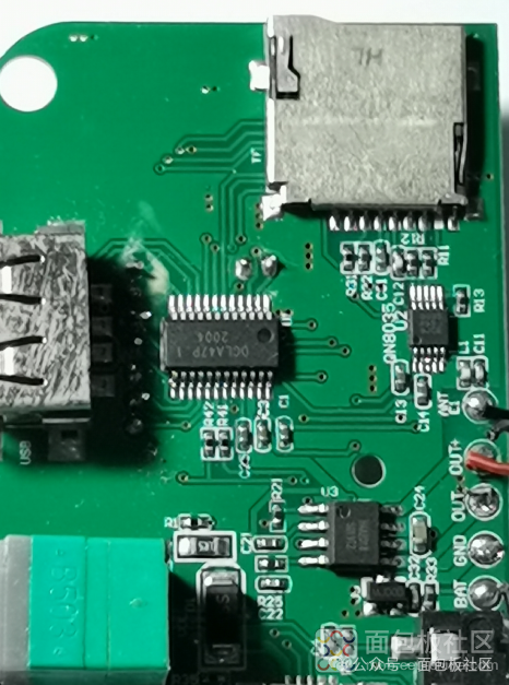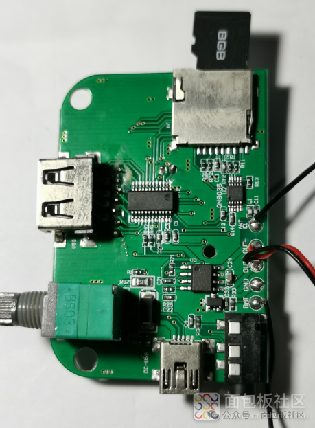 板上设有几个与外壳配合装配的主要结构端口和插座:一个USB座(用于连接电脑)、一个B503可调电位器、一个USB Type-B充电座、一个3.5mm耳机插孔,以及一个TF卡槽。