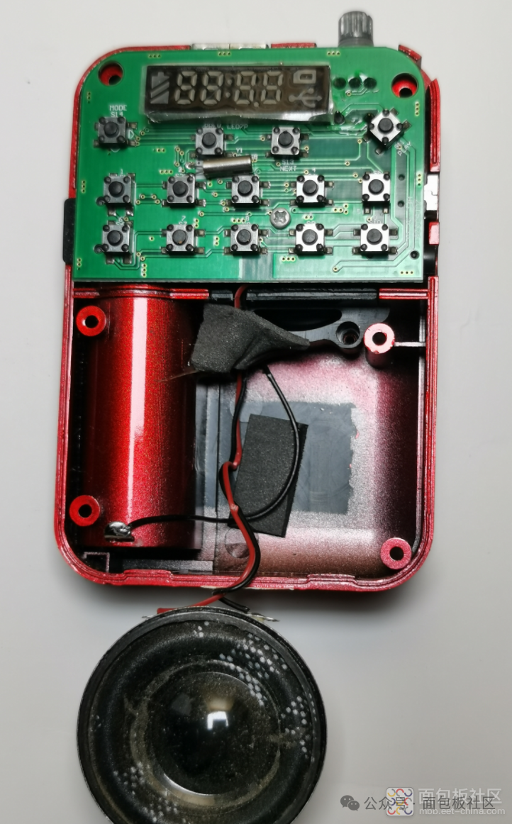 正如其名称所示,这确实是一台集成了多种功能的便携式收音机:支持FM收音、TF卡播放、USB连接、充电管理等。虽然整体成本不高,采用的是双层PCB板,但内部电路板与外壳的做工并不差。它使用了带电池保护电路的标准18650锂电池、通用的Type-B接口等成熟元器件,功能模块丰富。物料虽非高端新品,但也远非想象中那种极度廉价的劣质品。从电路设计、元件选型到红色外壳的细节,都能看出在产品上投入了一定心思和成本。