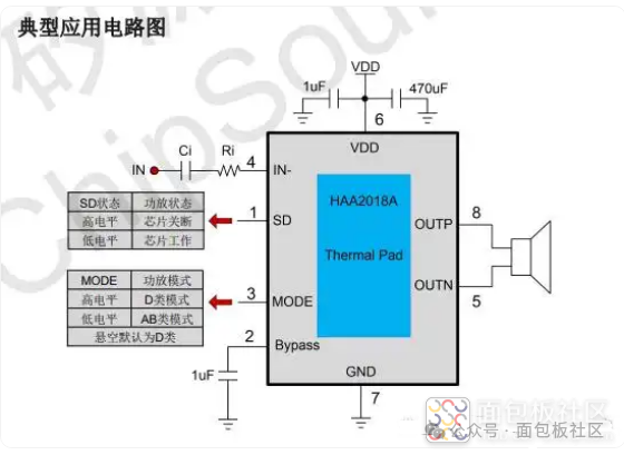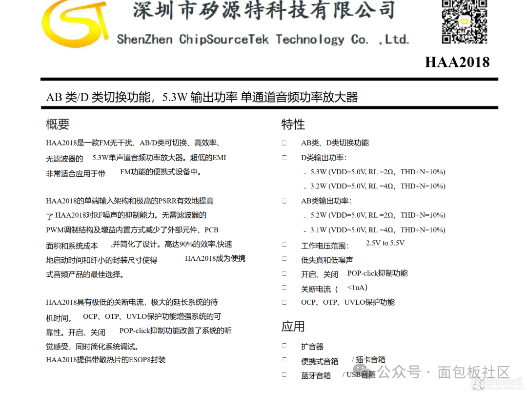 这里是矽源特的个HAA2018芯片,HAA2018A是AB类/D类切换功能,12W输出功率单通道音频功率放大器