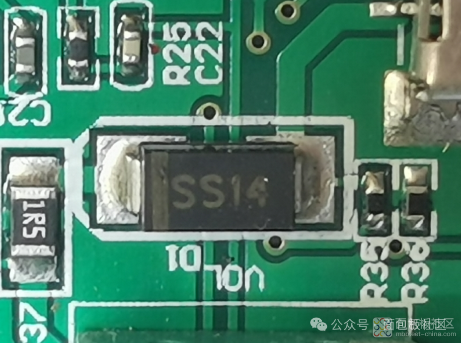 SS14肖特基二极管:最大反向峰值电压VRRM=40V,最大正向整流电流I(AV)=1A,最大正向压降VF=0.5V,最大反向泄漏电流IR=20mA。