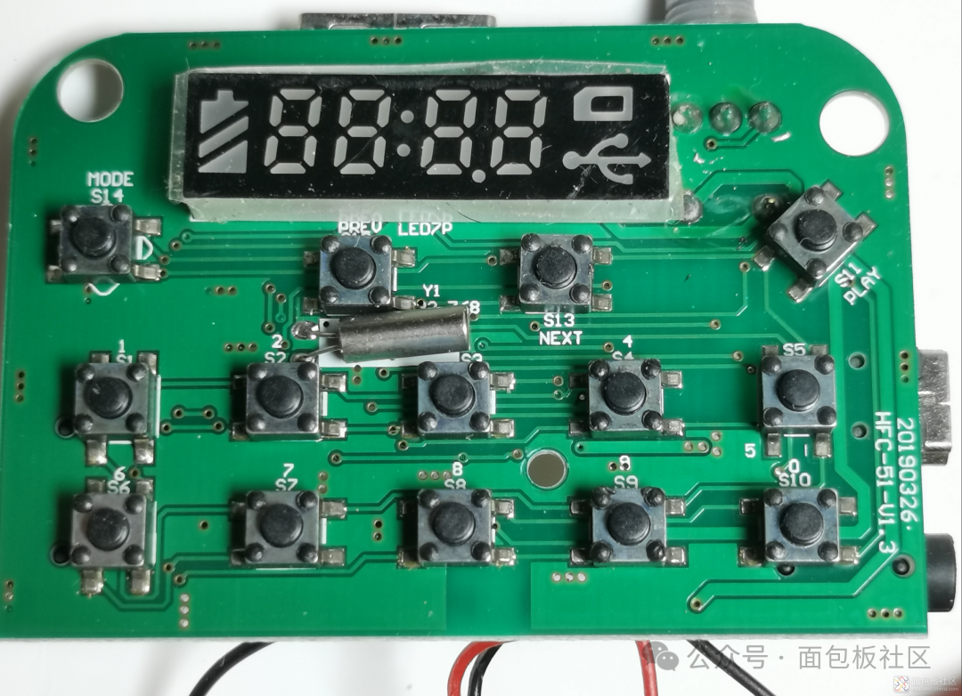14个键开关中间一个晶振,数码管在上面。每个按键标识有丝印代码。