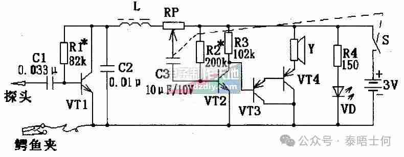 如果检测射频部分,可在上述基础上,增加一个由 9018 三极管搭建的简单射频放大电路,搭配 465kHz 陶瓷滤波器,就能制成射频寻迹器,用于定位调谐、中频放大等射频段故障。