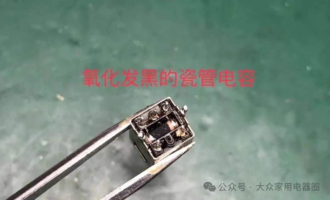 5. 调频灵敏度低。该机调频头使用分立元件,故障很少,灵敏度低应该重点怀疑中频输出变压器,其次是个别瓷片电容。我只遇到一起瓷片电容短路造成灵敏度低的问题,因此重点说说中频变压器也就是中周的问题。该机使用的中周都自带有瓷管谐振电容,这种电容有个通病就是时间久了氧化发黑导致中周失谐,Q值严重降低,使得信号传输效率降低,没有足够的中频信号输入中放从而导致灵敏度低,调谐灯没法点亮和音质不佳的问题。