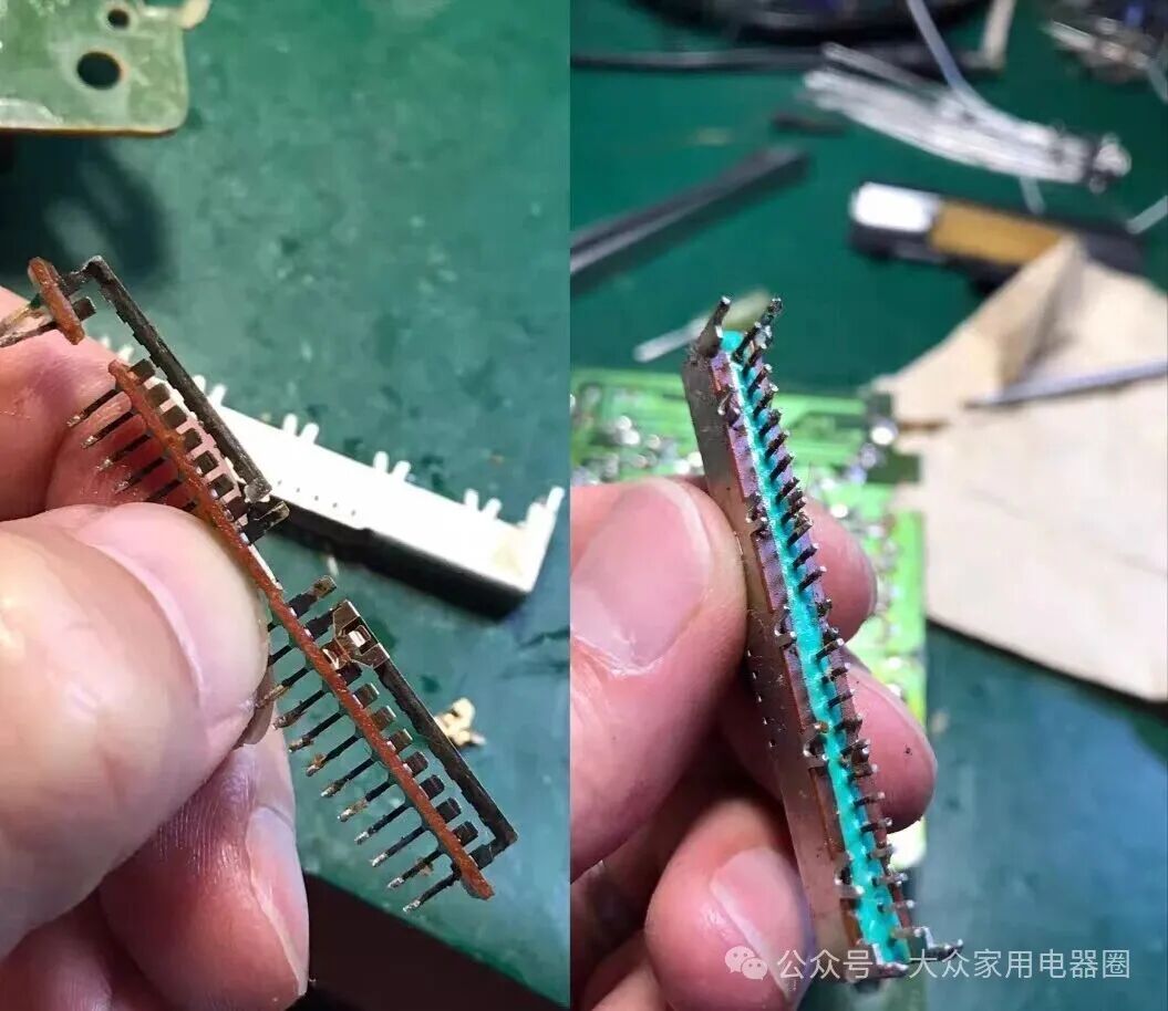 4. 波段开关的氧化清理。该机的波段开关密封的不好,触片很容易氧化发黑造成切换杂音或者接触不良甚至某波段无台。如果氧化不严重,可以注入除锈剂后多次来回拨动开关去除氧化层,如果无效,只有将开关拆下,然后拆开用砂纸去除动片静片的氧化,工作量大。