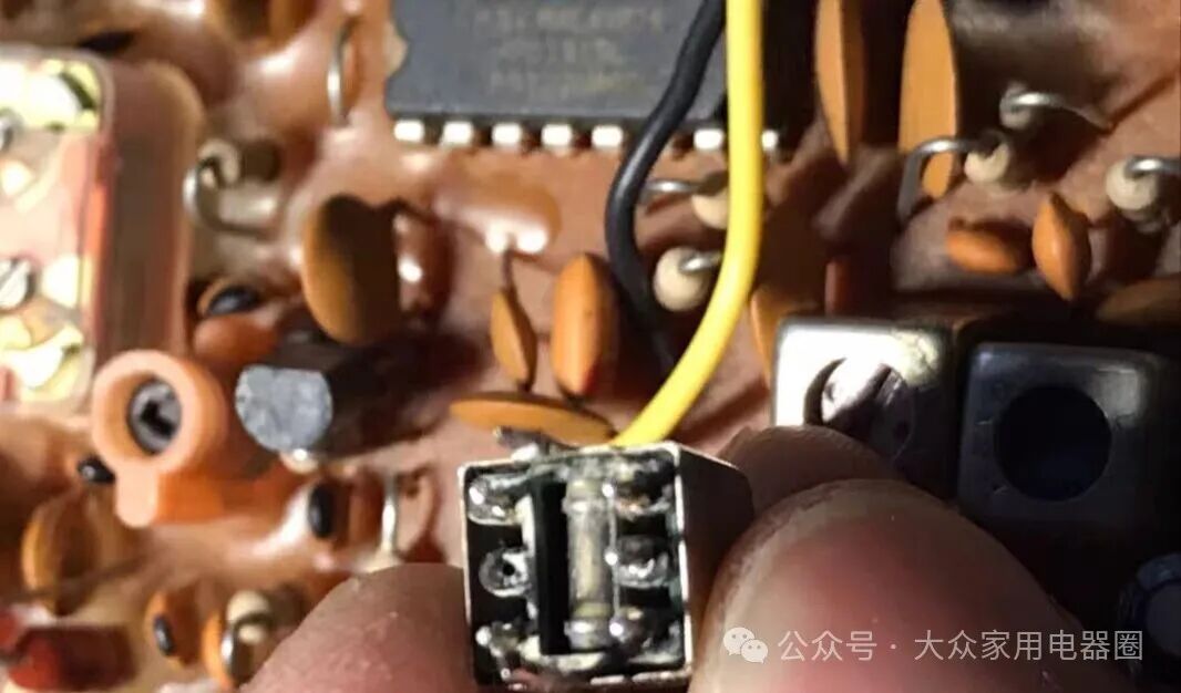 1. 拆机和调谐拉线拆装注意事项。拆机是维修的第一步,打开后盖特别简单,特别提醒的是该机电源开关设计不合理,必须把电源开关钮拔出才能取出主板,这个操作得使用蛮力,没有什么技巧可言,因此很容易造成开关钮卡口断裂,导致开关装回后松垮影响手感,因此拆机需谨慎,或者另外加装按钮开关。为了进行下面的故障维修,必须拆除调谐拉线才能把主板从框架上取下,在拆除拉线前,将指针调节到频率最低或者最高处,拍照记下主板上线盘的位置,你会发现装回的时候会非常的简单。否则,可能会费很多功夫,新手要抓狂崩溃。