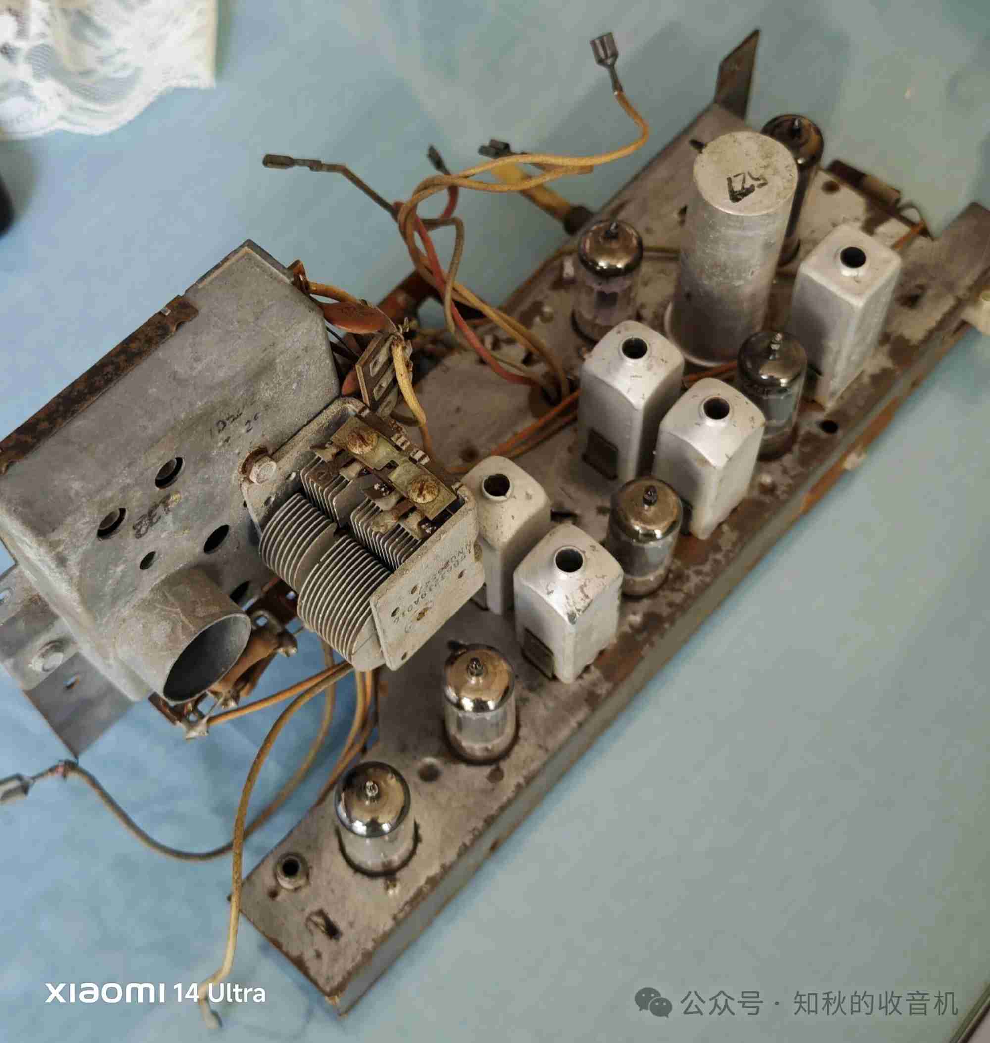 网上淘了一台机壳正面有摩托罗拉的英文字母,不知道是摩托罗拉的什么型号的收音机,此机也是串丝机,使用110伏电压,共用七只电子管,调频部分是两级中放,一极鉴频。调幅部分是正常的两级中放。所用电子管型号:12DT8 12BE6 12BA6 12BA6 12AU6,12AV6 50c5,管子都是摩托罗拉原装管。从管子型号和中放级数看,这是台高档收音机。