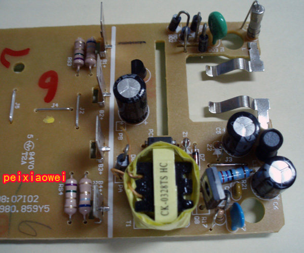 八、线路板正面:使用的是开关电路(电源变压),对市电适应性较强,100-240V,50/60Hz的市电都可正常使用,长时间充电也不会过热,不错!
