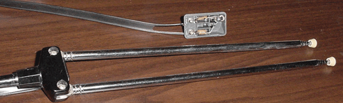一般的双角电视拉秆天线可用作FM半波偶极子天线用。这种天线一般自带一个由高频变压器构成的balun(如左图的小盒子),但要事先试验一下这个变压器能否经受你要发射的功率(线圈和磁芯不发热即可)。Balun的另一种解决办法是直接用同轴电缆作为馈线,将其饶直径大约10cm的4-5个圈(参看以上介绍)。