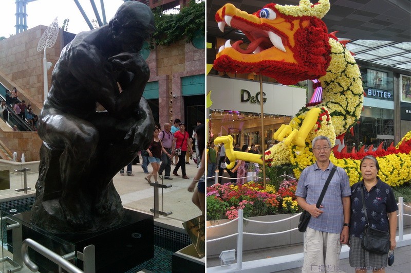 春节时,去逛了圣淘沙。游客以客工(打工仔)和旅游团为主。我和老伴在黄龙边照相,看智者罗丹塑像,还有迎春花展。