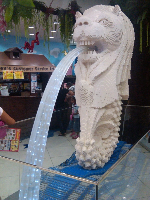 在牛车水唐人街(China town),逛春节市场、购物、品尝特色小吃,春节气味很浓。在参观商场时,玩具店门口用积木(Lego)搭的鱼尾狮,颇具特色: