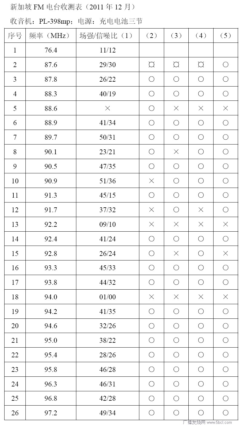 新加坡FM电台收测表(2011年12月)