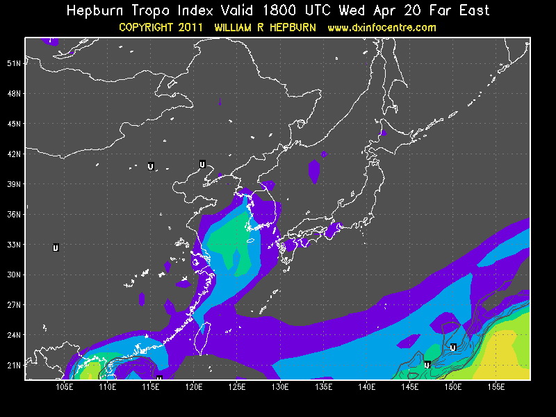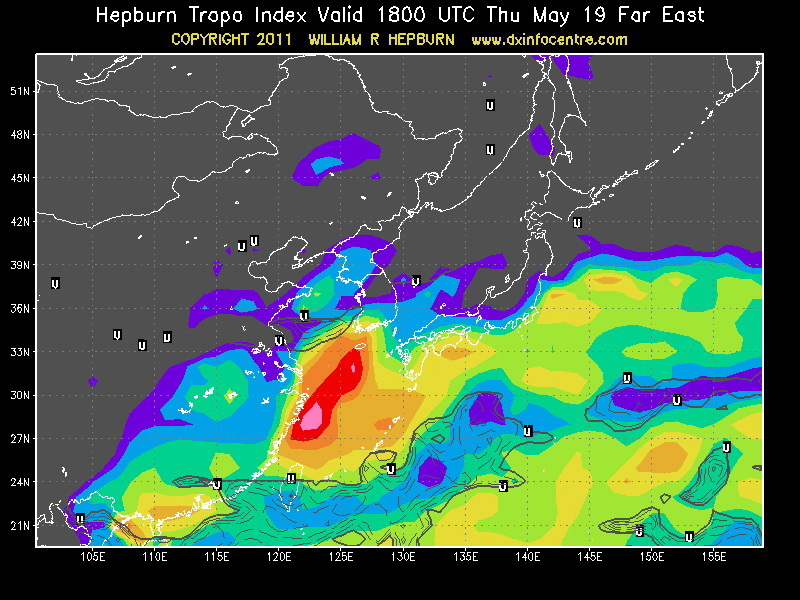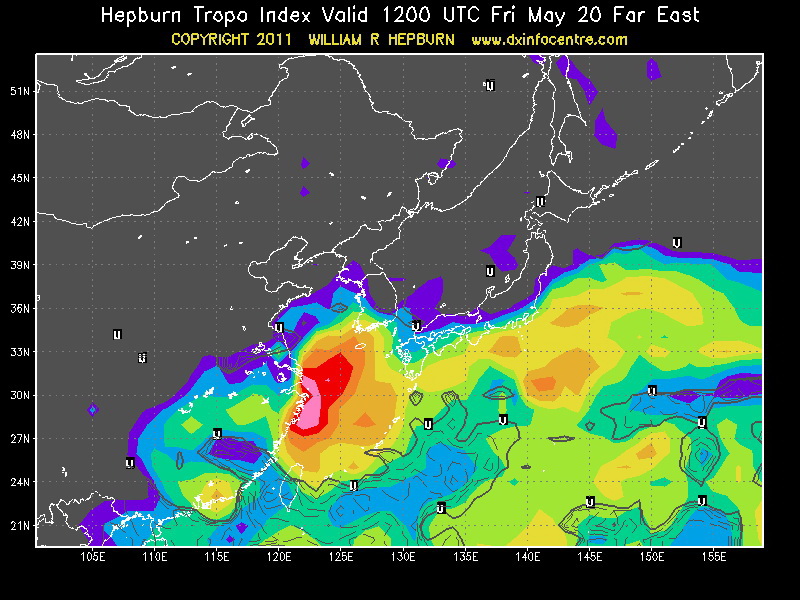 根据威廉姆·赫伯恩的全世界对流层波导传输预报,今天中午开始对流层的逆温层等级几乎达到最高——9级(粉红色),七度玄狐发现,信号正是在18:00左右明显增强。看明天还有不错的FMDX现象,中午还会出现个高峰。午后将恢复平静。