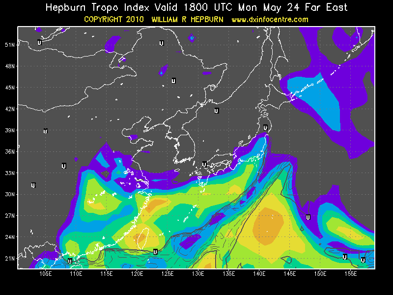 5/24收聽到的電視台有: 56.25(CH1), 64.25(CH2), 72.25(CH4) 都是中國河南河北地區電視台的聲音. 再查閱對流層電波預測圖可以看到整個區域內僅有大陸安徽附近有橘色土色區域, 恰好位於華北到台灣的中途.