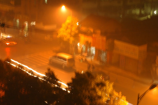 到了晚上九点钟的时候,窗外飘进一阵阵烟味,眼睛被辣得睁不开,直流泪。再看房间里到处充满蓝色的烟汽。就是把门窗关上也没有用。推窗一看,哎呀!外面的景象就是那美国未来灾难片中的一幕。赶紧上西祠搜索看看。发现我并不是第一个上传这个信息的人,大家群情激昂,已经热烈讨论开啦!