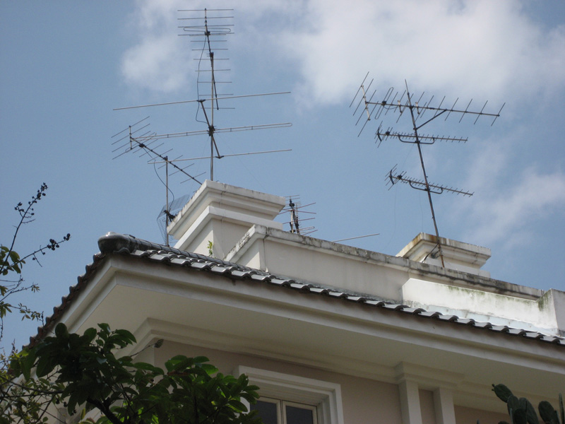我看了这些报道,想那些没有参加有线电视的用户怎么办?下面是一张在新加坡实地拍摄,洋房屋顶上的电视天线照片,——这也是一条出路: