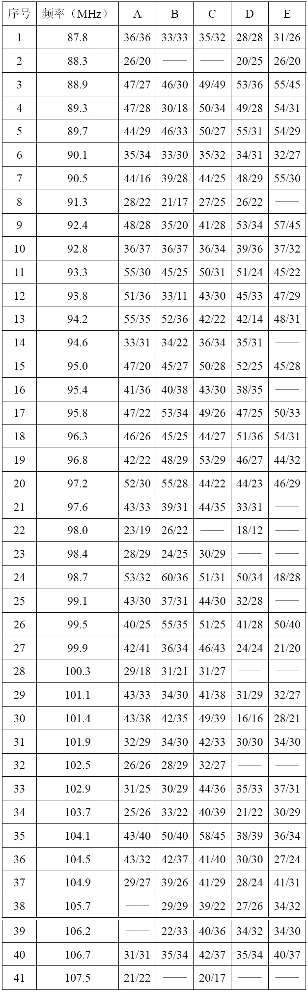 测试报告二:检查调频电台信号与接收高度的变化。测试方法同上,记录场强/信噪比dB值。测试点在同一垂直线上,高度: