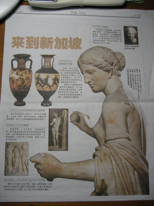 新加坡华人的心目中,文化和历史是非常重要的评价项目。写“听广播之三”时,三星堆文物展览是一个怪异而又实际存在的历史文物;本次在新加坡又参观了古希腊的文物,130件罗浮宫的古希腊稀世珍品,到新加坡博物馆展出;而现代华人作家高行健(诺贝尔文学奖得主)、张戎、王安亿、蓝博洲、苏童、北岛等又相继聚首新加坡作家节的会场内;中国南京大学中国语言文学院在新加坡举办的硕士生毕业典礼(第八届),在中国驻新加坡大使张小康的主持下进行,据说南大语文系在全国的排名仅次于北大,居第二位。