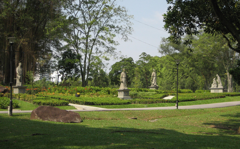 八座塑像坐落在充满浓郁华族文化氛围的裕华园。进门是七层宝塔,塑像坐落在大门入口右侧,每座像基砌上,写有三句英文口号: