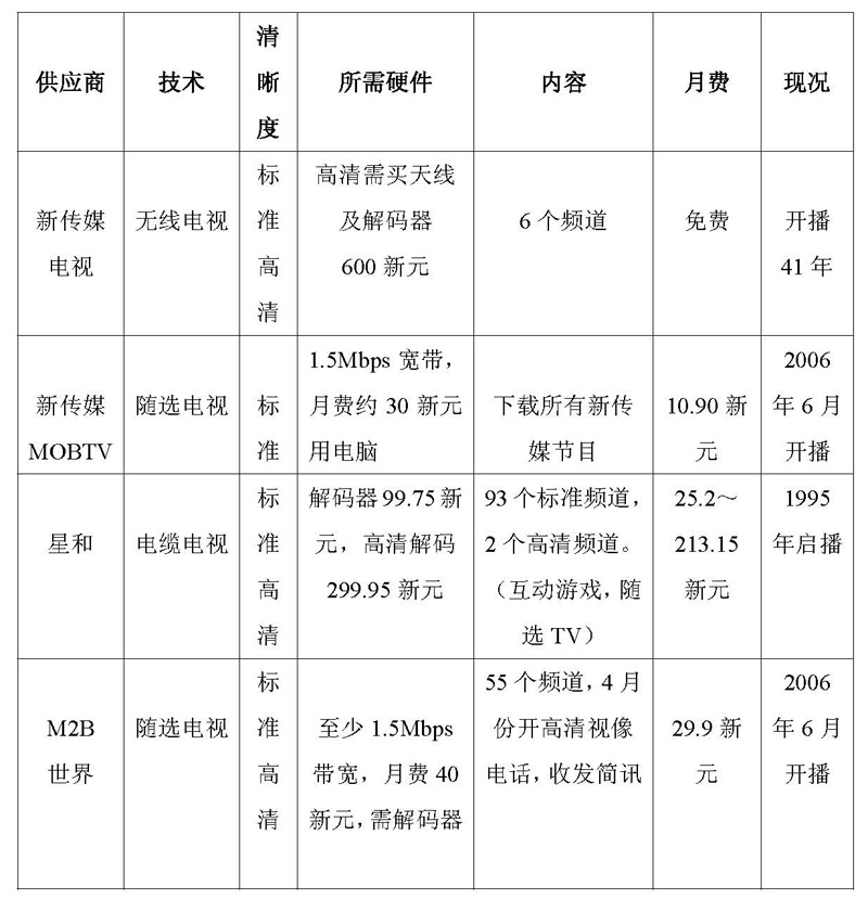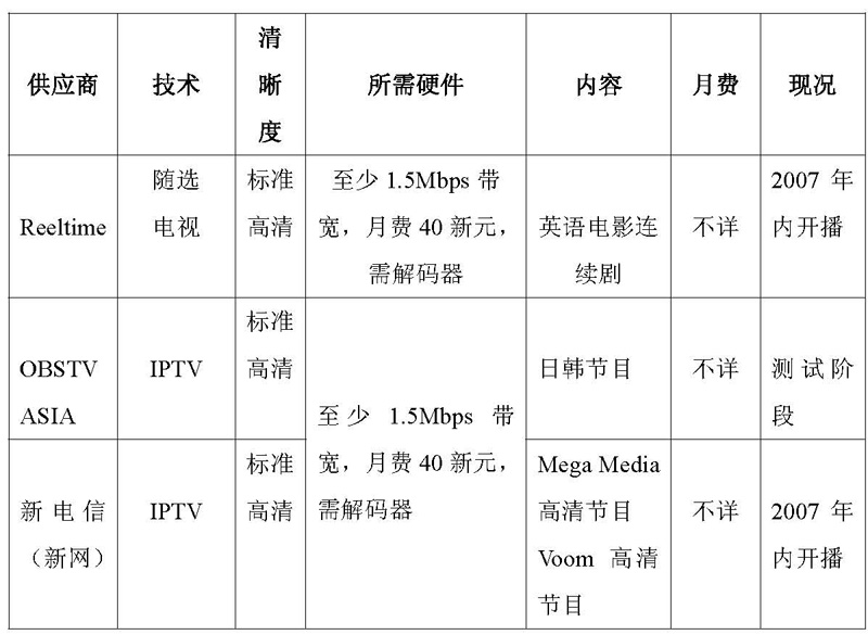 宽带电视服务比电缆电视的优势是:客户可以在任何时候选看节目,同时还可利用电视上网,开视像会议,玩互动游戏。已营业半年多的宽带电视服务商,一个是基地在美国的“M2B世界”,提供的节目涵盖时尚、体育、教育、连续剧和电影,一个55个频道的随选视像节目(Video-on-demand)。另一个是本地新传媒的“MOB电视”,节目有戏剧情景喜剧、资讯娱乐、实况和免费电视(本地有7套)播过的节目。另二个已领到执照的服务商,一个是澳洲的“Reel Time娱乐”,另一个是日本的“OBS电视亚洲”。前者提供随选视像节目,后者以日韩影剧为主。