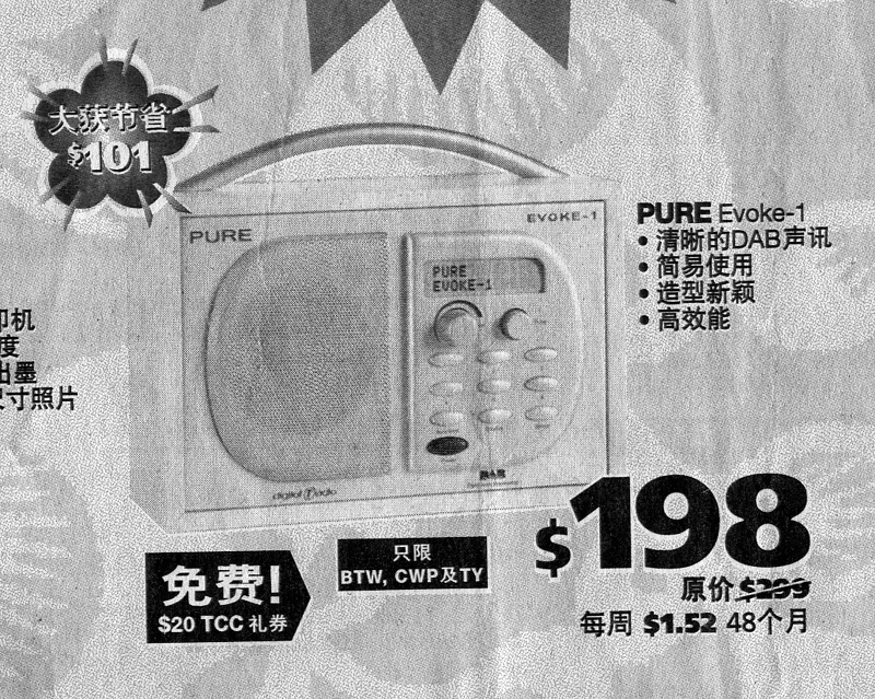 一次在文礼地铁站超市内,有民防部队展示装备及散发宣传资料,文中说为了“反恐”,要求市民家中准备二周的食品,还有电池供电的收音机。在最大的商场——新达城(SUNTEC),有乐声12波段收音机,售价折人民币约300元,报纸上的电子产品广告,有DAB收音机PURE Evoke-1,售价198新元,折人民币近1000元。在报纸及公交车体上,也有广播电台的广告!