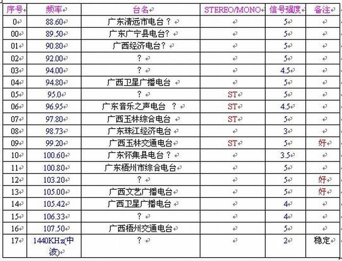 再手动调谐看看,能收到下列可懂度正常的电台: