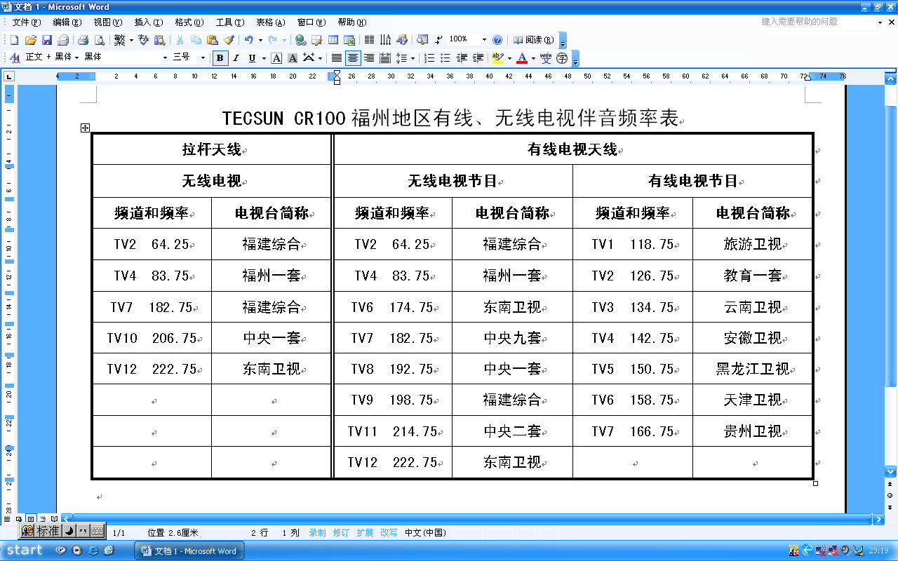 新鲜出炉——用CR100收到的福州地区无线、有线电视伴音节目频率表 广播发烧网 发布于 2006-1-7 00:00 BCL #频率 文章目录 × 推荐阅读珠三角九个城市以及港澳电台频率汇总浙江省各地区广播电台频率(修正)珠三角广播电台(按城市划分,标注主要的播音语言)中国主流城市FM频率表全国各省市中波广播频率详细表浙江地区广播电台频率中国大陆中波电台频率表 (上)西安市最新广播频率表南京地区广播电台频率一览表(最新)辽宁地区FM频率 上一篇 北京的FM收听报告 下一篇 收音机 - 浓缩百年艺术的精灵(一)