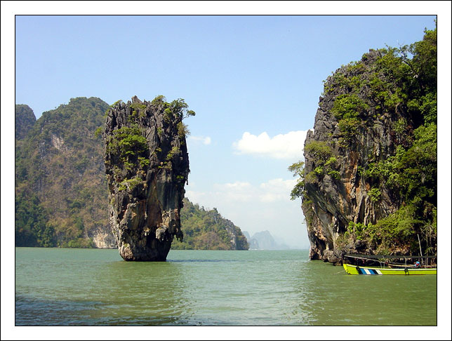 这里有典型的海上喀斯特岩溶地貌。其中以达铺岛(Khao Tapoo)最著名,Tapoo在泰语中是钉子的意思。至于为什么叫詹姆士·邦德(James-Bond)岛,那是1974年007系列电影《金手枪》(The Man with the Golden Gun)在这个长得像白菜一样的小岛上拍摄,所以泰国王也留下手迹纪念此事。攀牙湾当地人也都称这个詹姆士·邦德岛为007的“白菜岛”,也叫棒槌岛。它大约有20 米高。