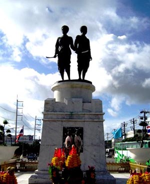 位于他朗市(Thalang)中心的巾帼英雄纪念碑(Heroine monument),庄(Chan)与穆(Mook)姐妹俩并肩矗立在码头广场(Tha Rua Square),凡经过这里的居民都会合掌膜拜或者用按喇吧来表示尊敬。