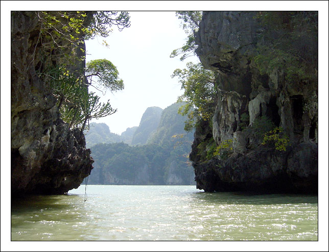 终于来到了挽隆湾,游艇早已等候在那里,大家鱼贯而上,找地方坐好直驰攀牙湾。一路上只见湾内散布着许多大大小小的岛屿山峰耸峙、怪石嶙峋、山水入画、景色变幻万千。这一带也称《割喉群島》,俗称“南洋小桂林”。