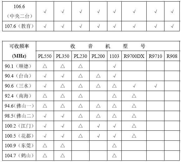(三)由于有的收音机FM波段覆盖76~108MHz,比较76~88MHz频率的可收电台,五台数调机都可以收到白云山索道的调频广播(用普通话和广州话轮流放录音),频率是79.5MHz。PL-550、PL350、PL-230、PL-200四台数调机,在76~88MHz频段可收到二次中频(镜像)信号的节目,具体为: