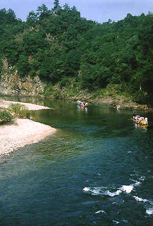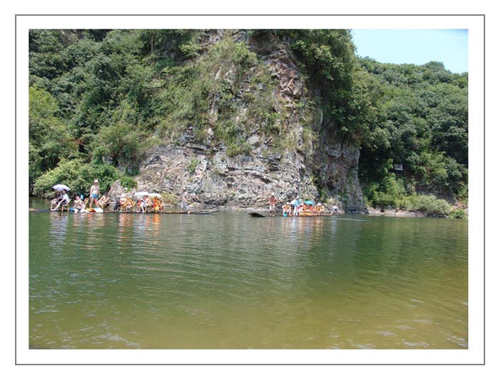 11:30 放筏,自己由于要摄影,记录FMDX Log,不想开水仗,主动与一群MM待在一艘筏子上.首先来到早雾山景区,这里经常云缭雾绕,平静的水面倒映着群山的身影,使游人的心情豁然开朗.忽然河道急转,来到"刁潭".这里河道蜿蜒曲折,两岸奇峰异石千姿百态,风光绮丽.