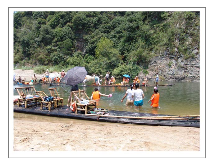 胡村出来是一处浅湾,有着宽阔的白色细沙滩,是一处优良泳场.当然现在却是"战场".一时间刀光剑影,水花四溅,人嘶马喊,白浪淘天.水枪、水瓢、双手一起上.更有勇者干脆跳下筏子,跃入水中,近军作战.几个心细的不断向我摆"泡斯",双手伸着"V"字,我也随即掐了几张.最惨的是有一段时间,我们被夹在两只竹筏中间,腹背受敌,全筏人一个个浑身湿透透,我还算机灵,用事先准备好的密封袋将"两德"与相机护入其中.酣战之后,水面一片狼籍,断瓢碎竹也逐流而下.
