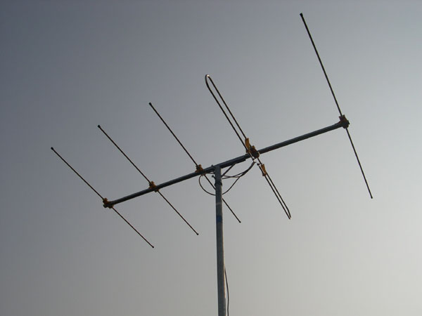 我翻出《电视接收天线》和《自制高频甚高频天线手册》两本老书,加强了理论学习,明确了前进方向——五单元的半波折合振子天线,还找到了调频发烧网站甘铭晓站长的FM天线设计图,使我免去了复杂的计算,在此表示深深的感谢。为了配合东莞创建国家卫生城市,用料要豪华高档坚固……:)天线振子选用了12mm的不锈钢管,横梁用不锈钢方管,振子通过电木绝缘板固定在横梁上,天线杆用了1"2口径的4米长镀锌水管,整副天线看上去银光闪闪,十分漂亮。天线的加工和安装都是由我的堂哥负责,他是五金加工专业人士,心灵手又巧,振子加工精度在毫米之内,安装稳固牢靠。我负责接线,使用U形转换器与75欧馈线连接,用不锈钢螺丝螺母将馈线的铜芯线用大力拧死在振子两端,据堂哥称,这是冷压连接法,接触很可靠。接下来就是确定天线的方向了。我请堂哥留在楼顶,根据我的接收目标,把天线对准了东南方,也就是香港方向,然后缓慢转动,每转几度角就停下来,我在家中把收音头调到98.7Mhz的香港电台第四台上,通过室内无线电话向堂哥报告接收效果。经过几番周折,确定了两个效果较佳的方向,做好了标记。第一个方向香港电台第四台收听效果为可听级,但其他香港电台效果麻麻地,第二个方向则各台的接收效果比较均衡,但第四台较差。再三权衡,最后选择了第二个方向。