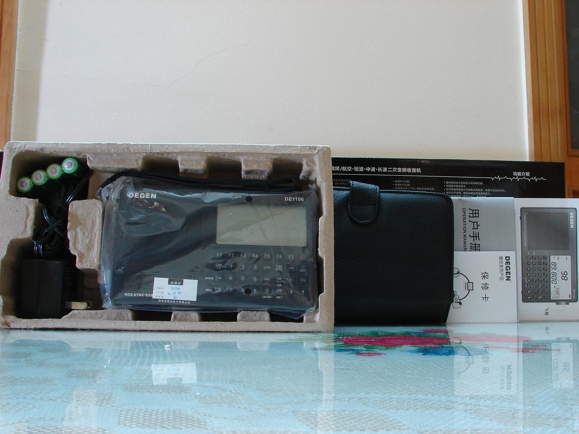 该有的附件都有,还附送了音频连接线,外包装黑色彩盒超薄,里面的防震材料使用的是环保的再生纸,前900位订购的还送了一付大耳机,试用下来一般,感觉还没德生的E-805好,就不上图了.
