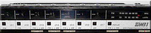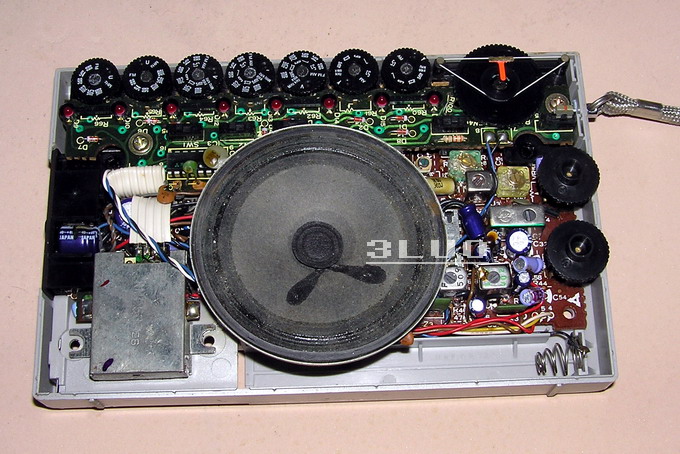 内部我再继续拆,不太好拆,没有拍照了,没有发现调谐薄膜可变电容。除了右上角大的调谐盘外,左边还有7个小的调谐盘,一样是88-108的频率,这种调台方式就是:你在每一小盘调好你要听的电台即可,上面有按钮,你按哪一个就听哪一个电台。还可以浏览(扫描)方式选择电台。如果你都不喜欢,你就通过右边的大调谐盘选择电台。
