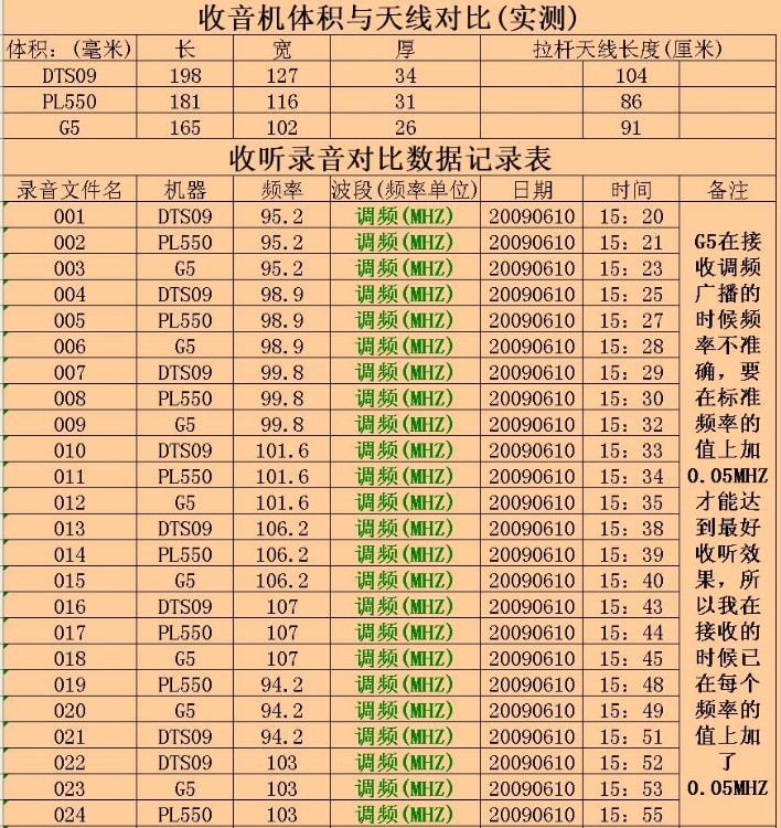 对比内容:三机全部对比调频、中波及短波。DTS09与G5对比SSB。机器都放在DX档、音乐档;带宽PL550多数放在窄带,录音中有短暂停顿的为宽窄变化;其它两机放宽带位置。用DE808录音成WAV格式,再用软件转换成MP3格式上传以供试听。