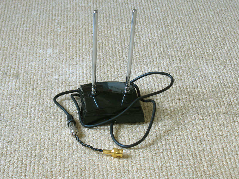 改制好的调频偶极天线。原型是VHF/UFH电视天线,展开后变成一幅全长1.32m的偶极天线,虽然短了点(标准调频1/2波长偶极天线需要1.46m),但还勉强适合调频广播。