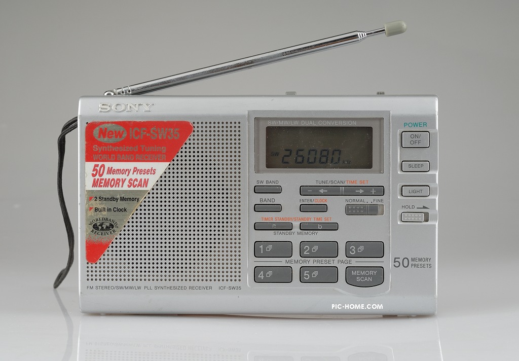 第三台是索尼的ICF-SW35,一部令我非常无奈的机器!说严重了,根本就是一鸡肋。为什么这么说呢?接收性能就不说了,短波比不上SW11,此机搜台非常麻烦,没直接输入频率功能,报给你一个短波频率,要你调出这个频率,要先选到对应的米波段,然后用快搜台功能,搜到一个台停一下,搜到一个台停一下,直到屏幕显示到你要的频率,然后马上按+ -键让变动的频率停下