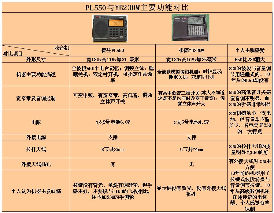 在AM波段,包括中波和短波,PL550的接收灵敏度比YB230稍高一点点!但YB230的背噪明显比PL550小,这在听广播的时候,特别是在短波弱台的时候,个人更喜欢用230,而不是550。
