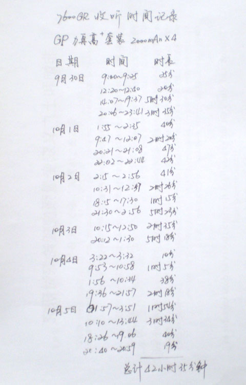 不明白为什么GR会得到“电老虎”的称号!我最大的惊喜就是她相当省电! GP2000mAn充电电池(力再高套装),电池标示需充满16个小时。第一次充电14小时,中等音量下共使用了32小时30分钟左右,其中,FM30小时左右,AM(对比测试)2小时30分钟左右;第二次充电16小时,共使用42小时35分钟(见图),基本为FM收听,需要说明的是我住所的收听环境并不是很好。记得论坛上有朋友说使用充电电池GR能连续收听50小时(FM),当时遭到了不少朋友的嘲笑和指责,现在看来,换装更大容量电池或更好的收听环境可以轻松实现。最近有朋友询问我GR的能耗问题,担心频繁的拆换电池会损坏电池仓盖,这也是我购买前的一个担忧,目前我依然担心,电池仓盖感觉有些紧,坚固程度也不足,建议使用更大容量的名牌充电电池。接收AM的使用时间没有具体统计,不过一般规律是相同环境下AM的收听时间为FM收听时间的70%左右。评价机器的能耗是要因机而异的,德生R911使用普通的雷达电池(早些年5毛钱两节)能连续播放50小时以上,记得03年春节4节雷达电池让我的R911唱响了整整一个假期,给我带来了一程至今依然怀念的广播之旅。我们可以说R911巨省电,相反的,不能因为GR使用2000mAn电池才能收听不到50小时就说她是“电老虎”,简单的低电压机械电路是不能作为复杂高电压数调电路的能耗参考的。另外,关于充电电池影响接收性能的问题没有进行比较。