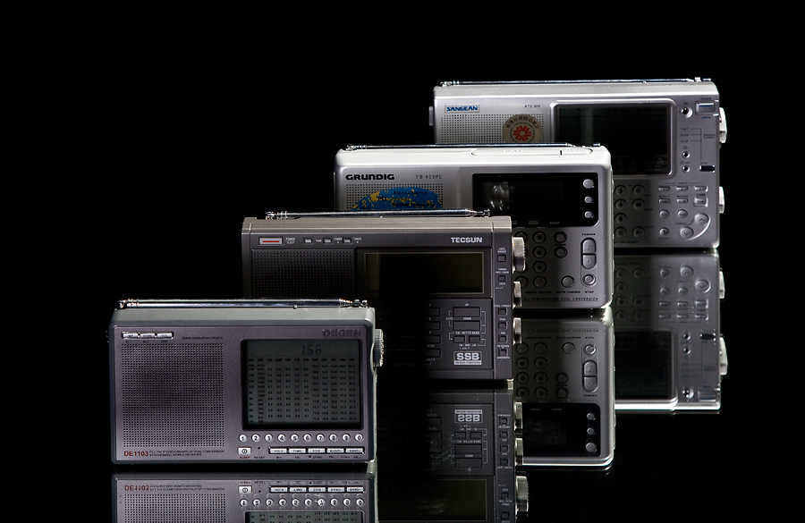 先对机子生产年份作个说明,因为有DX说机子用久了性能会下降!DE1103和ATS909最早购入,记得好象是04年底或者05年初进的,大家看图片会说DE1103是新版啊!在俺家小女元宝(俺前几天发过元宝和收音机的故事帖子)一岁多时,用烟灰缸把显示屏给砸裂了,今年初到德劲公司花了五十元换了前后壳,所以机芯还是老版的!PL600是今年一月份生产的,YB400PE是上个月从SHWX处购入的,生产时间也应该有些年头了。