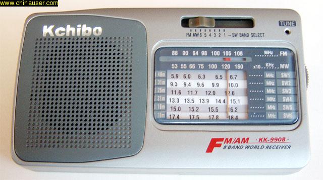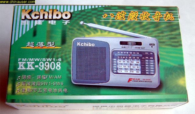 凯隆KK-9908的正面脱帽像。左面有一道很小的圆弧,扬声器面罩设计也很有特色,尤其是“Kchibo”的商标非常突出。FM、MW、SW1-6公用一个波段开关,转换波段比较方便。左边是带开关的音量电位器,附带有耳机插孔;右面是调谐拨盘,我想用“非常好”三个字来形容该收音机的调谐手感力度:很轻、很稳,没有一丝回差应力。