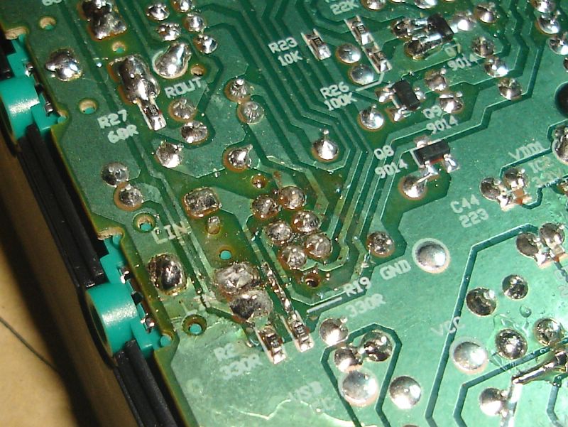 手工焊接的痕迹,遗留下来的松香都发黑了: