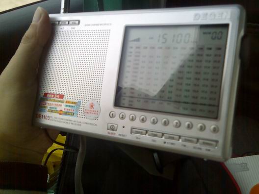 在路上,1103的短波接收能力很出色,朝鲜之声中午时段1100-1200的播音,仅靠本机天线(拉出约70CM),收听情况已经相当不错,下午收听CVC的15250也很好。傍晚使用DE31有源天线,把软线环挂在车窗玻璃上,接收RFI的5900,11875,很稳定,信号满格,用本机天线,声音听不出区别,信号不能满格。接收DW的15640和17820,比RFI还要好。