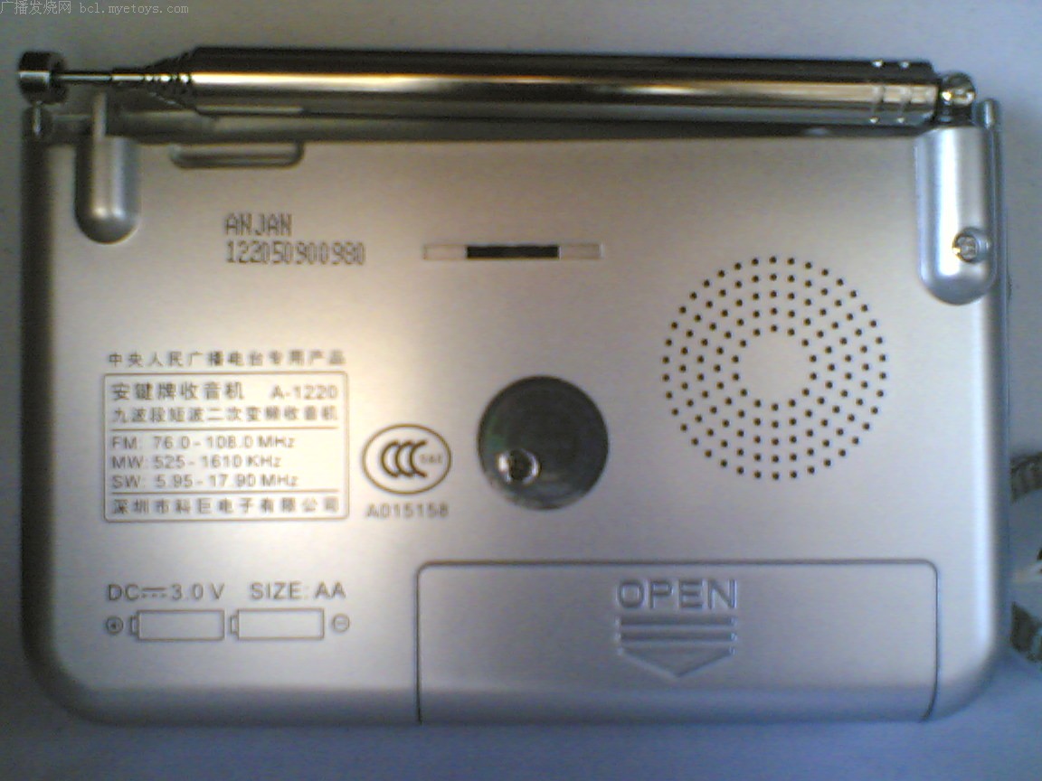 1220是一款模拟指针调谐机器,具有中短波,调频立体声接收,外观采用拉丝工艺,手感不错,不同颜色的搭配适合不同人群的欣赏需要,电台信号强度,立体声,电源等都通过3盏不同颜色的发光二极管显示出来,天线共有8节,对于一般接收能很好胜任,可惜1220没有外接天线插口,对于采用室外天线的朋友不是很方便。1220的技术指标是:FM:76.0-108.0 MHZ MW:525-1610KHZ SW:5.95-17:90 MHZ 短波第一中频:10.7MHZ 短波二中频:455KHZ 噪限灵敏度 FM:优于 10uv MW:优于 1mv/m SW:优于30uv 单信号选择性:优于20dB 尺寸:115X72X23mm。本次重点测试接收性能。